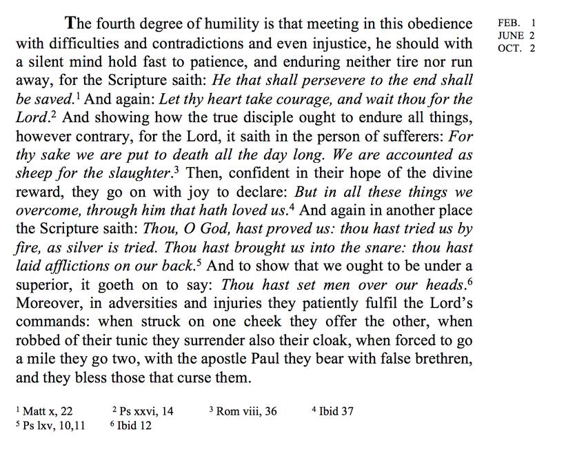 The fourth degree of humility is that meeting in this obedience with difficulties and contradictions and even injustice, he should with a silent mind hold fast to patience, and enduring neither tire nor run away, for the Scripture saith: He that shall persevere to the end shall be saved.1 And again: Let thy heart take courage, and wait thou for the Lord.2 And showing how the true disciple ought to .. read more »